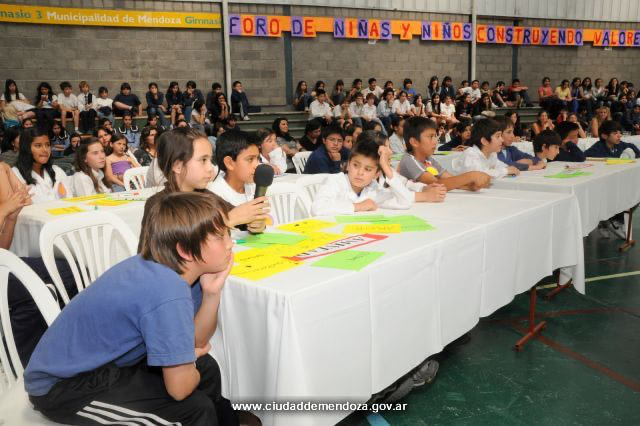 En el marco del 20º Aniversario de la Convención Internacional de los Derechos de Niñas, Niños y Adolescentes;  la Municipalidad de Mendoza organizó el Foro de niñas y niños “Construyendo Valores”. La actividad se realizó en las instalaciones del Gimnasio Nº 3 y participaron más de 500 chicos; alumnos de 5º,6º y 7º  de escuelas de Capital que vienen trabajando desde hace dos años en el Ciclo de Cine “Construyendo Valores”  que realiza y coordina el Departamento de Familia, Niñez y Adolescencia.