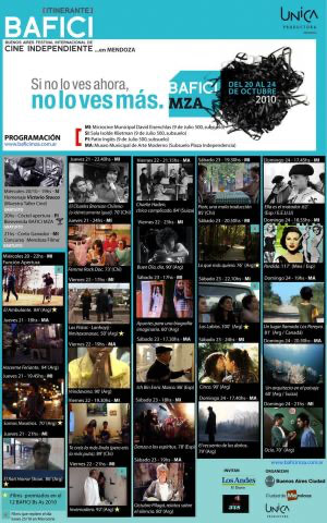 La muestra itinerante del Buenos Aires Festival Internacional de Cine Independiente (Bafici) llega a nuestra provincia del 20 al 24 de octubre, organizado por la Municipalidad de la Ciudad de Mendoza y Única Productora.