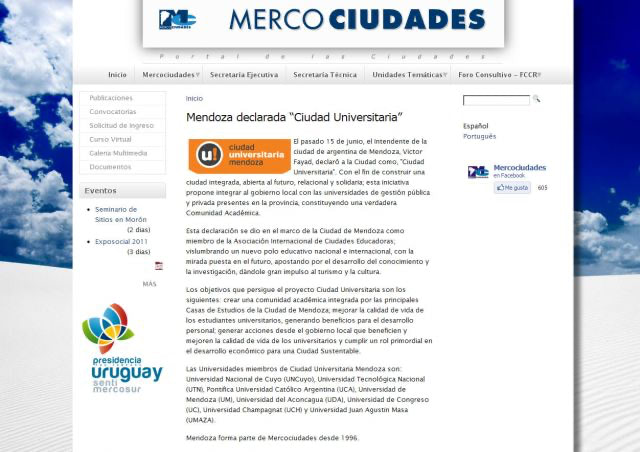 Ciudad Universitaria fue publicada en el portal de internet de Merco Ciudades www.mercociudades.org