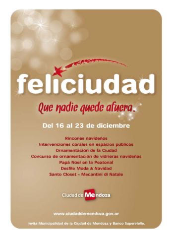 En esta edición, la Ciudad de Mendoza ofrecerá una nutrida agenda de propuestas que incluye desfile de moda en la Peatonal, intervenciones corales en distintos rincones de la Ciudad, concurso  de ornamentación de  vidrieras de locales comerciales, Concierto 143º Aniversario de la creación de la Municipalidad de la Ciudad de Mendoza,  Papá Noel y espectáculos artísticos de cierre de “Feliciudad” en Pérgola de la Peatonal.