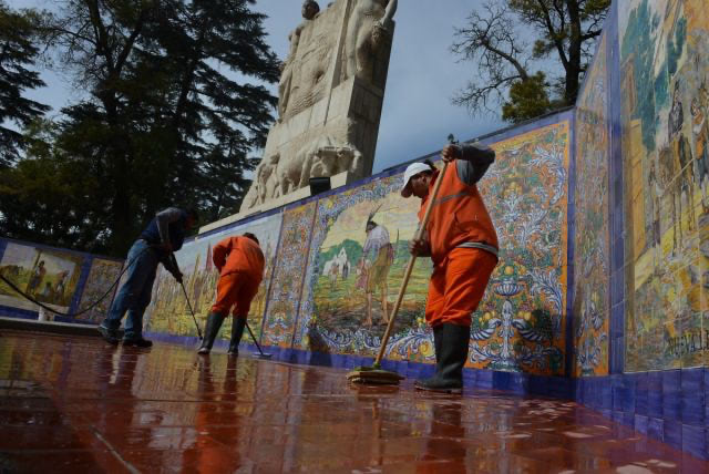 Las tareas de restauración también incluyen mejoras de canteros, bancos, mosaicos, limpieza del monumento y pintadas en aerosol.