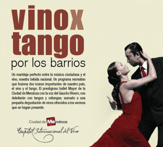El programa Vino x Tango sigue recorriendo los barrios, esta vez es el turno del Bº Sanidad. Los vecinos podrán bailar al ritmo del Ballet Municipal y degustar un exquisito Malbec.
