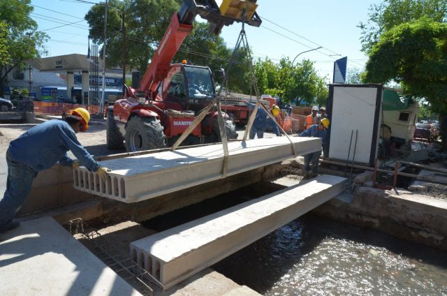 El viernes pasado se colocaron las vigas pretensadas sobre las cuales se colocará una capa de hormigón, en la que se apoyará el adoquinamiento articulado,  similares a los que hay sobre la calzada de Juan B. Justo.
