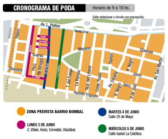 Continuamos con los trabajos de poda y desrame de la arboleda en distintos puntos de la Ciudad. El 3, 4 y 5 de junio de 9 a 18 horas, estos trabajos se realizarán en el Bº Bombal.
