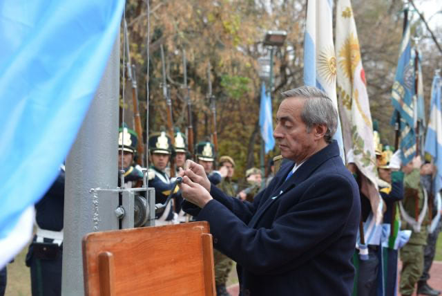 El intendente Víctor Fayad presidió el acto del Día de la Bandera. Participaron el presidente del Concejo Deliberante, Rodolfo Suárez, el General de Brigada, Alejandro L. López, concejales, abanderados y alumnos del colegio Pablo Nogués.