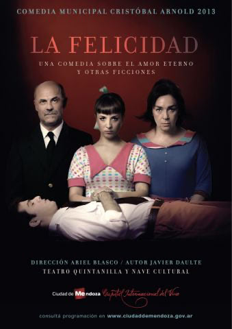 “La Felicidad”, escrita por Javier Daulte (Bs.As) es una comedia sobre el amor eterno y otras ficciones. Una historia repleta de mentiras y engaños. Una pareja de padres obsesionada por la felicidad de su hija Rosa, acepta un malvado plan: raptar al joven de quien la mujer está enamorada sin ser correspondida para narcotizarlo y crear una realidad ilusoria.