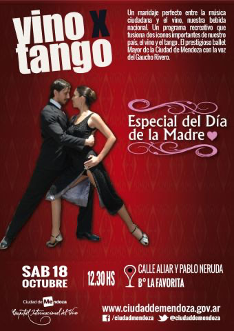 El sábado18, seguimos nuestro homenaje en el Barrio La Favorita. Allí llega nuestro show Vino x Tango, con la actuación del Ballet Municipal y la voz del Gaucho Rivero. La cita es a las 12.30hs, en Calle Aliar y Pablo Neruda.