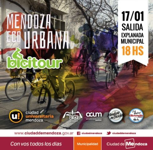 Este 17 de enero, invitamos a vecinos y turistas a realizar un hermoso circuito guiado en bicicleta por diversos lugares emblemáticos de nuestra Ciudad. La bicicleteada está enmarcada en Mendoza Eco Urbana, que recibirá a los ciclistas como destino final del recorrido. Allí, los participantes podrán disfrutar de variadas actividades gratuitas.
