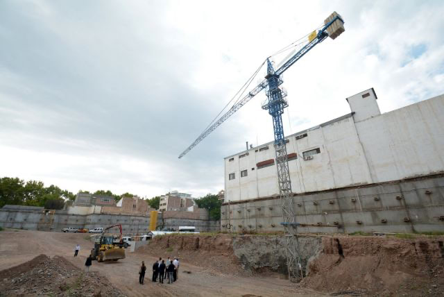 Se instaló la primera de las tres grúas que trabajaran en el emprendimiento, ésta, tiene un brazo de 52 metros y una altura, en esta primera etapa de 30 metros. Sobre el terreno de 10.000 m2, con 52 metros de frente sobre avenida San Martín y salida a las 3 calles restantes (Alem, Don Bosco y Primitivo de la Reta), se construirán 7 niveles que totalizarán 70.000m2 cubiertos.