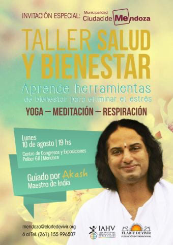En conjunto con la Fundación El Arte de Vivir, convocamos a los vecinos a participar del Taller “Salud y Bienestar”, dictado por Akash Barwal, maestro de la India de visita en Mendoza, que se llevará a cabo el lunes 10 de agosto a las 19 en la Sala Magna del Centro de Congresos y Exposiciones (Peltier 611, de Ciudad).