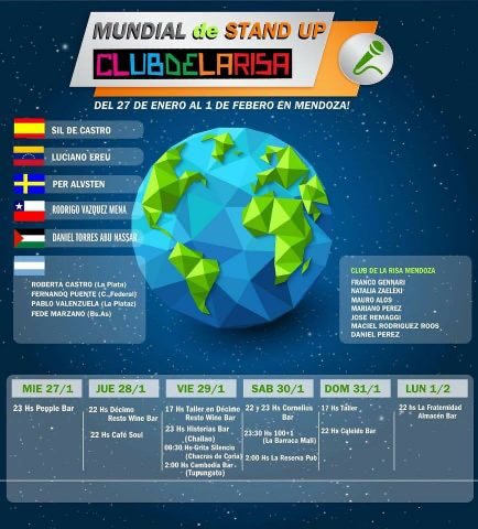 Con el apoyo de la Municipalidad de Mendoza, el Club de la Risa demostrará que las carcajadas son un lenguaje universal con el primer Mundial de Stand Up. Este evento que reúne a humoristas de distintas partes del planeta comenzará este miércoles 27 de enero y se desarrollará en distintos espacios de la provincia hasta el lunes 1 de febrero.