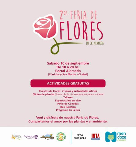 Organizado por la Municipalidad, el INTA y la Mesa Florícola de Mendoza, y bajo la premisa “Traé tu planta”, el próximo 10 de septiembre de 10 as 20 hs., en el Portal Alameda, (Córdoba y San Martin) se llevará a cabo el segundo encuentro de la “Feria de flores”.