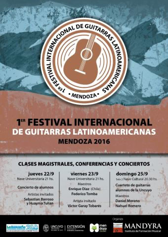 Diferentes estilos musicales de guitarras latinoamericanas se darán cita en Mendoza desde el jueves 22 al domingo 25 de septiembre. Entre los guitarristas que ofrecerán conciertos y clases magistrales se puede mencionar a Nahuel Romero, Víctor Garay Tobares, Daniel Moreno, Enrique Díaz Lakao y Federico Tomba. Además actuará como invitado el dúo compuesto por Sebastián Barroso y Huayma Tulián.