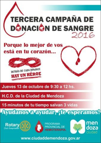 El Honorable Concejo Deliberante junto a Rotary, Incaimen y el Centro de Hemoterapia realizará la última de tres campañas organizadas durante el 2016 (ver). Como siempre, nos acompañará la Embajada Mundial de Activistas por la Paz.