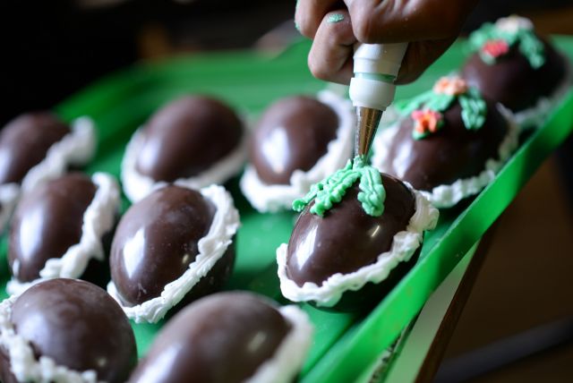 Las tareas se dividen en grupos: unos fabrican las tapitas, en otro sector se coloca la sorpresa, las lentejas de chocolate y se cierra el huevo con glacé, mientras que en un tercer grupo realiza la decoración y el envasado.