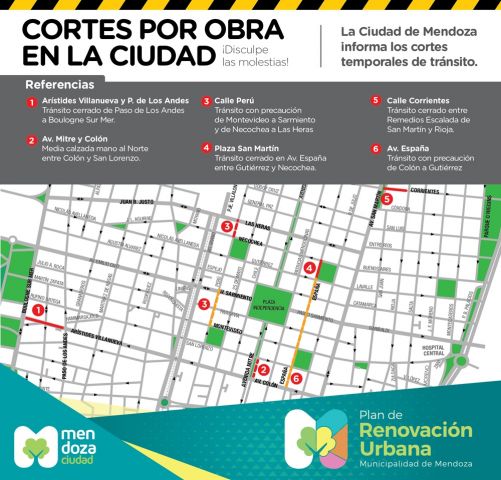 Los cortes de tránsito que actualmente están vigentes son: en calle Corrientes desde Remedios Escalada de San Martín a Rioja (Obra: Circuito Sanmartiniano); España entre Gutiérrez y Necochea Obra: Remodelación Plaza San Martín); Perú desde Montevideo a Sarmiento y de Necochea a Las Heras (Obra: repavimentación calle Perú, sin cortes con precaución); Mitre desde Colón a San Lorenzo (obra: Centralidad), media calzada mano al norte; Arístides Villanueva desde Boulogne Sur Mer a Paso de los Andes (obra: Paseo Arístides Villanueva).
