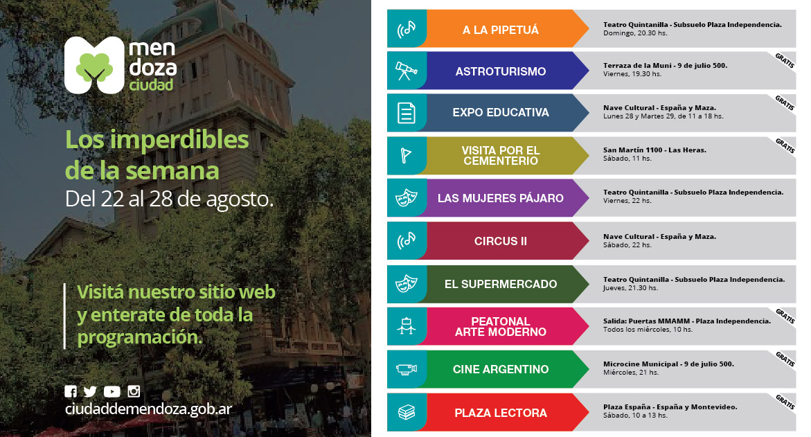 Teatro, literatura, cementerio, astros, educación, cine, paseos. Sí, todo eso en una semana: del 22 al 28 de agosto. Son siete días donde no podés perderte ninguna de las propuestas de la muni. Claro, elegí de acuerdo a tus gustos, ¡ofertas sobran!