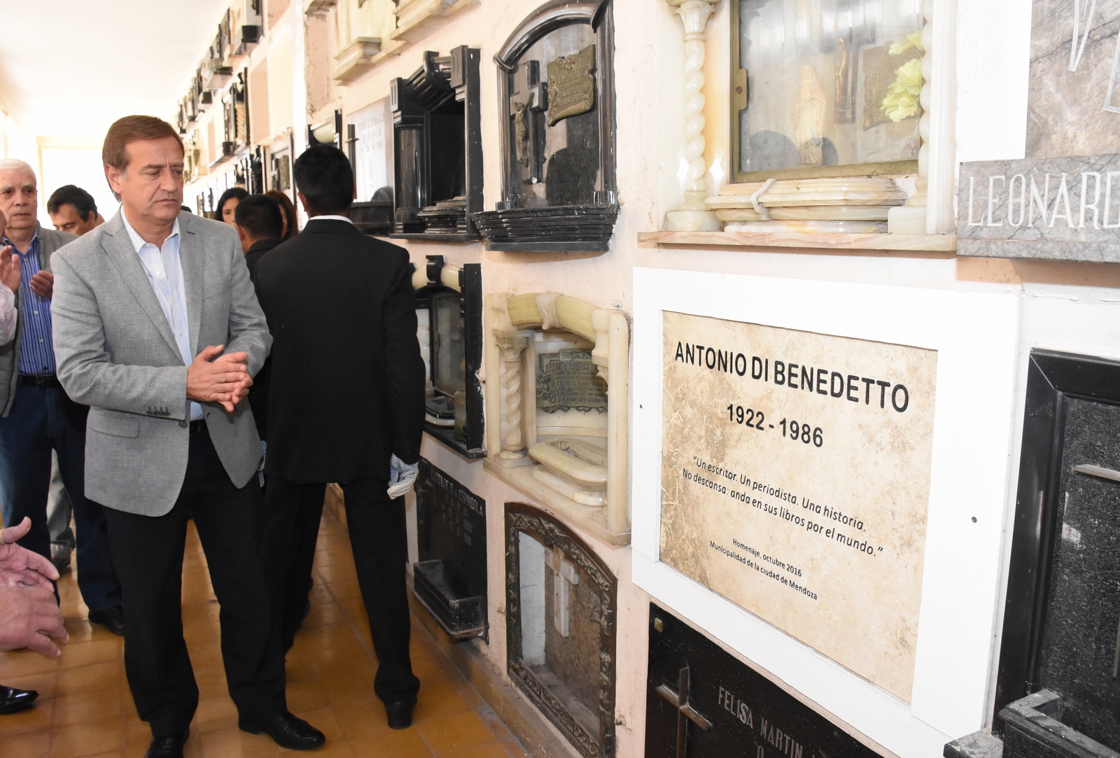 En el cementerio de la Capital se realizó un acto homenaje al creador mendocino de grandes obras literarias: Antonio Di Benedetto. Bajo la autorización de su hija, Antonio fue trasladado del Panteón de los Periodistas al Pabellón de los Notables, donde también se encuentra Frank Romero Day, la primera reina de la Ciudad de Mendoza, hombres y mujeres que hicieron obras de gran valor para nuestra provincia.