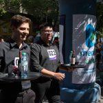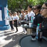 Ochenta mozos y camareras se prepararon en el punto de salida con bandeja en mano. Sobre ésta los participantes llevaban una botella de vino, una de agua y una copa de vino.
