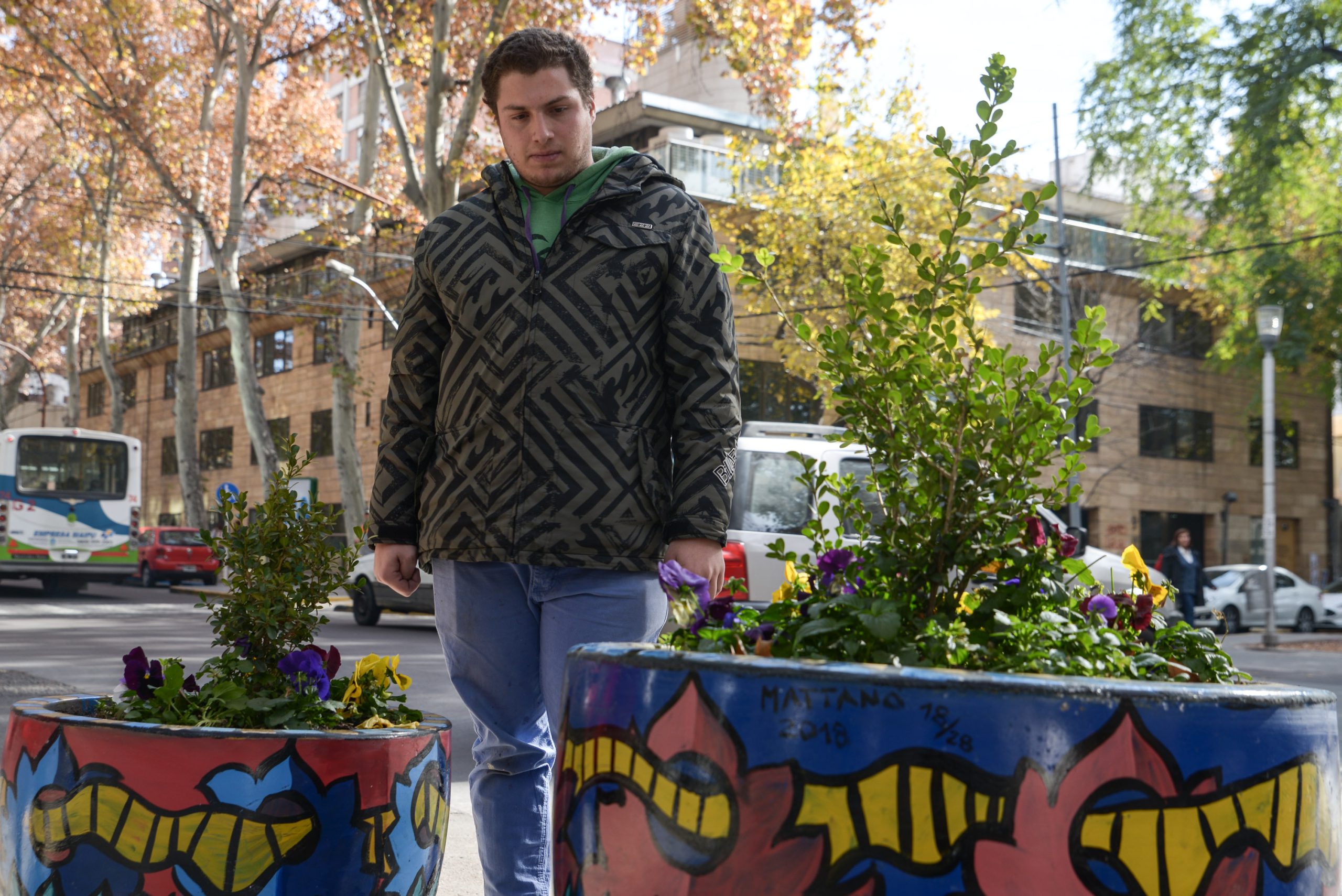 Quienes transiten por la Ciudad de Mendoza, ya pueden conocer la intervención artística que realizó el pintor Tomás Mattano (22) en las macetas que, a través de flores de estación, le dan vida al denominado nuevo centro, precisamente en calle Mitre, desde Colón hasta la Plaza Independencia.