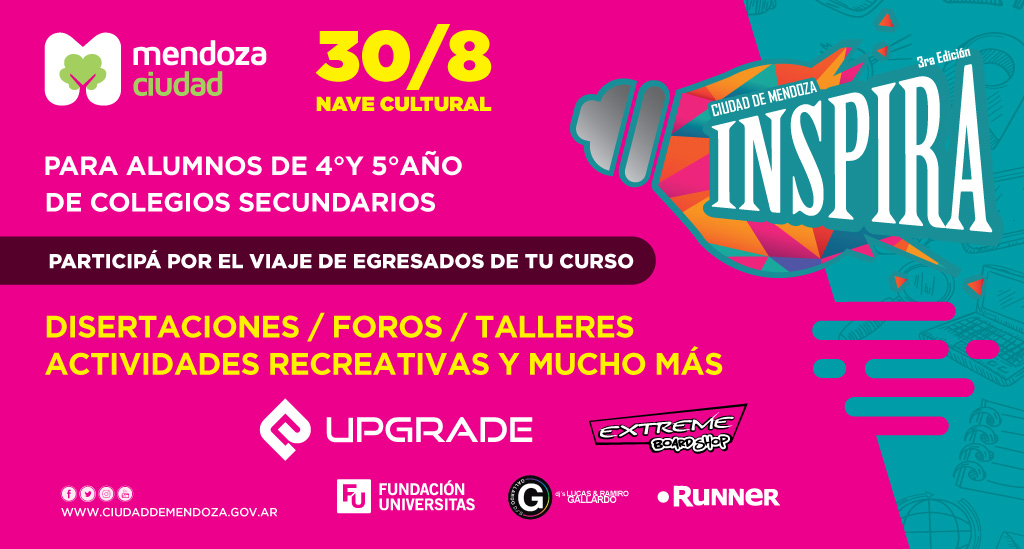 La Municipalidad de Mendoza realizará la tercera edición de Inspira, un seminario destinado a generar espacios de comunicación y expresión para los jóvenes. A partir de esta experiencia participativa, los jóvenes, podrán potenciar sus ideas que se transformarán en grandes proyectos. El encuentro se realizará el 30 de agosto de 9 a 17 en la Nave Cultural y podés inscribirte aquí para participar por los premios. Además, dentro de todas las actividades previstas, se destaca la presencia de Agustín Aristarán, más conocido como “Radagast”. El comediante, actor, mago y artista profesional mostrará su talento luego de su éxito en el teatro y la televisión.