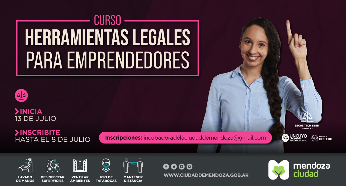 La Municipalidad de Mendoza, en conjunto con Legaltech Seed y la Facultad de Derecho de la Universidad Nacional de Cuyo, invita a una capacitación para emprendedores que deseen capacitarse en temas legales. La cápsula estará dirigida a emprendedores que estén en los comienzos de sus proyectos o bien en etapas de aceleración, a público en general y a todos los interesados en aprender tips legales básicos para comenzar su propio proyecto.