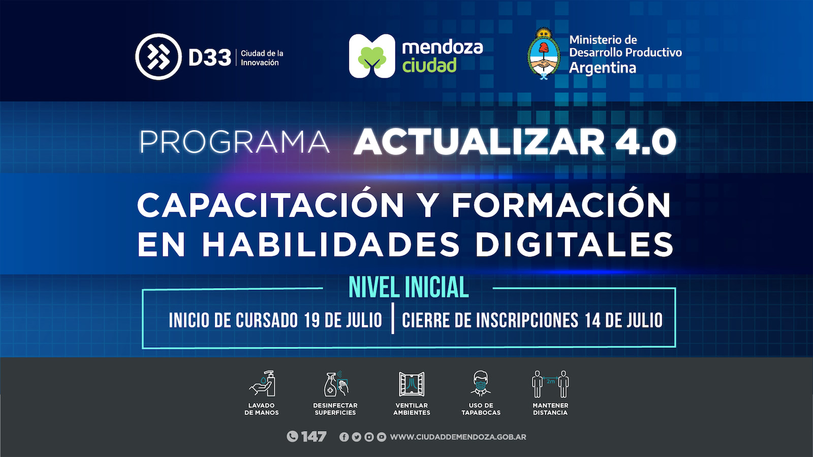 La Municipalidad de Mendoza, junto a la Subsecretaría de Desarrollo del Conocimiento, perteneciente al Ministerio de Desarrollo Productivo de la Nación; presenta el programa Actualizar 4.0, que tiene como finalidad capacitar en habilidades digitales para mejorar la empleabilidad y que está destinado a personas en vulnerabilidad social y a mayores de 40 años desempleados, con el fin de promover su inserción laboral, propiciando la alfabetización digital.