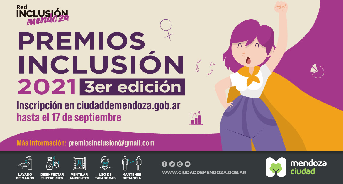 La municipalidad de la Ciudad de Mendoza, en conjunto con la Red de Inclusión Mendoza , extienden su convocatoria a organizaciones sociales, instituciones, fundaciones, escuelas, ciudadanos/as o empresas que quieran participar de la tercera edición de los Premios Inclusión 2021. La convocatoria se encuentra abierta hasta el 17 de septiembre y busca potenciar proyectos que trabajan para la promoción de los derechos por parte de toda la ciudadanía.