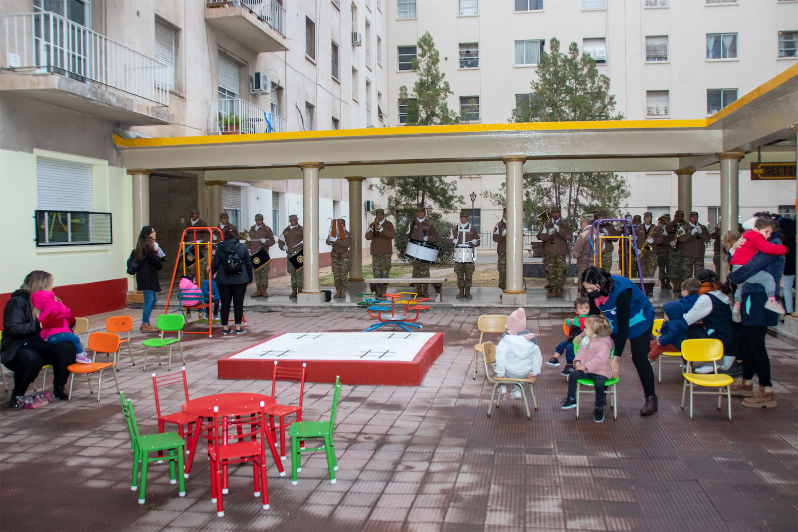 Seguidamente, la banda del ejército entonó, con bombos, platillos y trompetas, canciones infantiles, marchas nacionales y desfiló al compás de la música. Además, niñas y niños que asisten al jardín probaron los nuevos juegos y se sentaron en las mesas de la plaza.