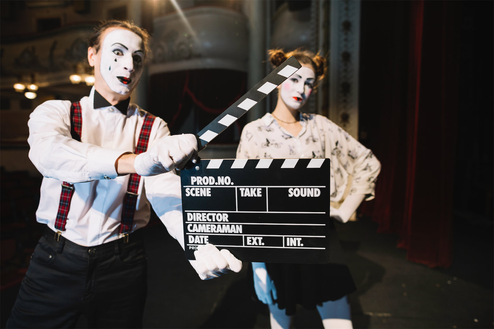 male mime artist holding clapper in front of female mime artist