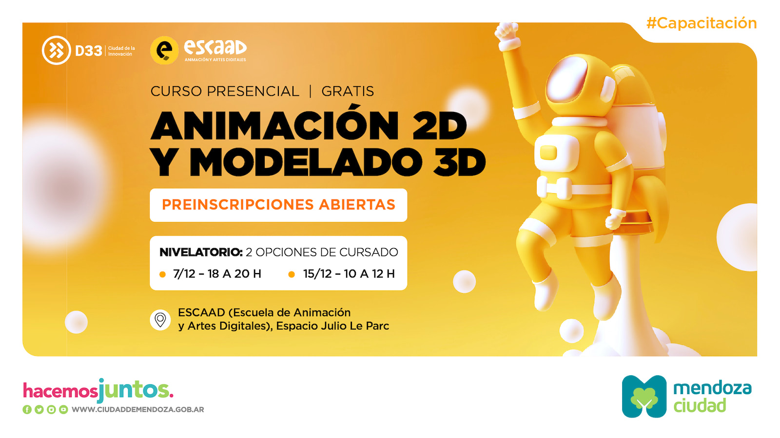 La Municipalidad de la Ciudad de Mendoza junto a la Escuela de Animación y Artes Digitales (ESCAAD) se unen para llevar a cabo una novedosa capacitación en Animación 2D y Modelado 3D, totalmente gratuita.