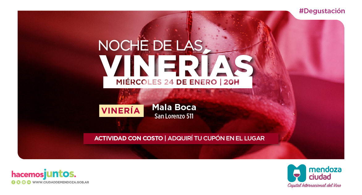 En verano, la Ciudad de Mendoza renueva su invitación a participar de una nueva edición de la “Noche de las vinerías”. La misma se realizará el próximo 24 de enero, a las 20h, en el local Mala Boca (San Lorenzo 511, Ciudad).