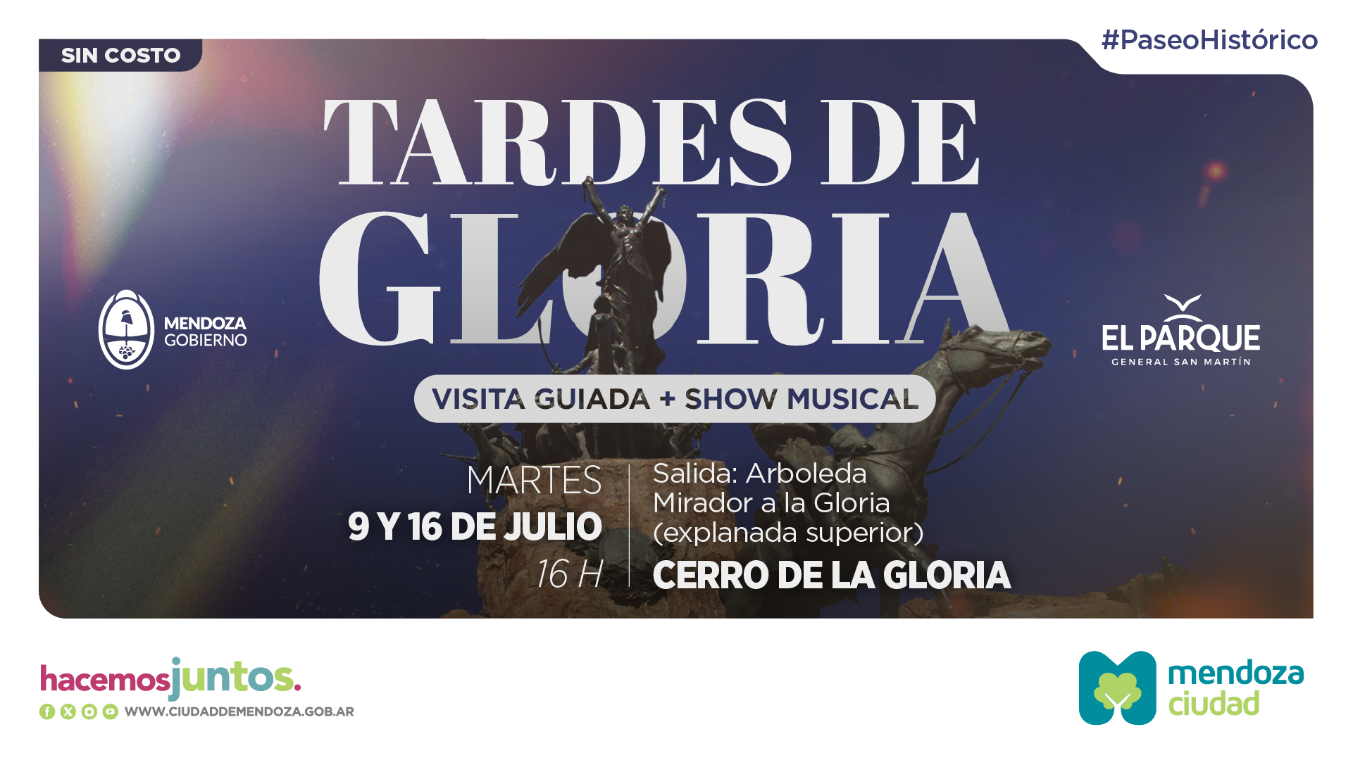La Ciudad de Mendoza te invita este mes a participar de dos nuevas ediciones de Tardes de Gloria. Las mismas tendrán lugar los martes 9 y 16 de julio, a las 16h, donde podrás sumarte para disfrutar de una entretenida propuesta. La actividad no tiene costo.