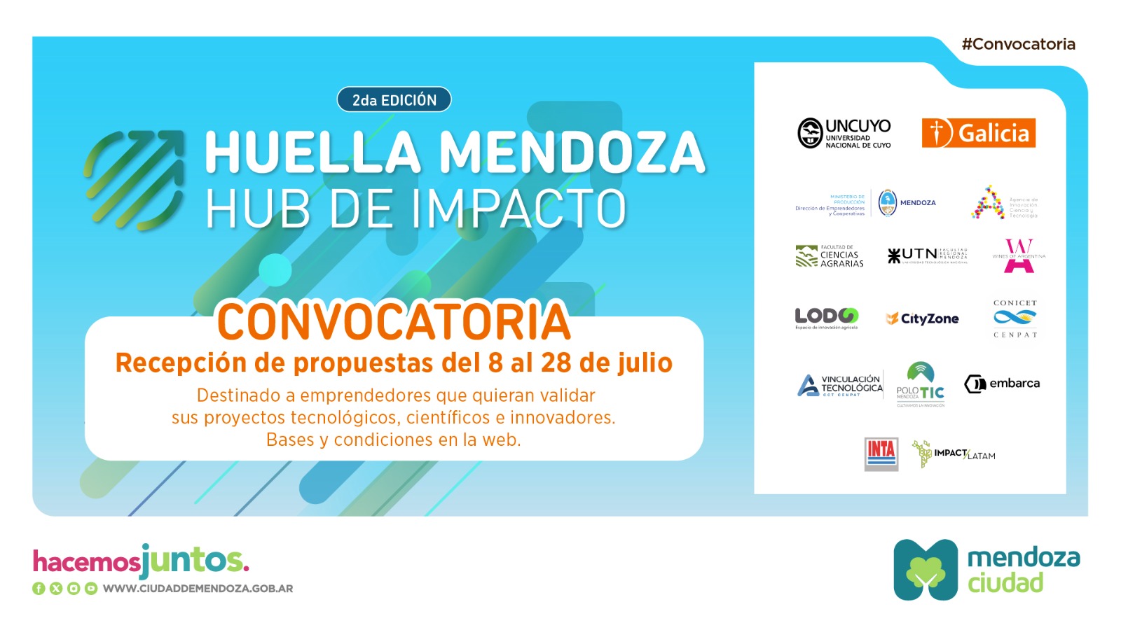 La Municipalidad de la Ciudad de Mendoza junto al Banco Galicia y con el acompañamiento de la Universidad Nacional de Cuyo, abrió la convocatoria de proyectos para la segunda edición del Hub de Impacto: Huella Mendoza, una iniciativa que convoca a solucionadores que cuenten con proyectos productivos, tecnológicos y/o científicos e innovadores de Argentina, Chile, Uruguay, Perú, Bolivia y Paraguay, con el potencial para solucionar problemáticas locales. Las inscripciones están disponibles en este enlace, hasta el 28 de julio.