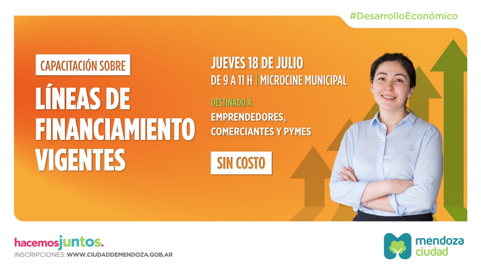 La Ciudad, a través de la Secretaría de Desarrollo Económico, invita a emprendedores, comerciantes y pequeñas empresas a participar de una capacitación gratuita sobre líneas de financiamiento vigentes. El evento se realizará el Jueves 18 de julio a las 9, en el Microcine Municipal ubicado en 9 de Julio 500.