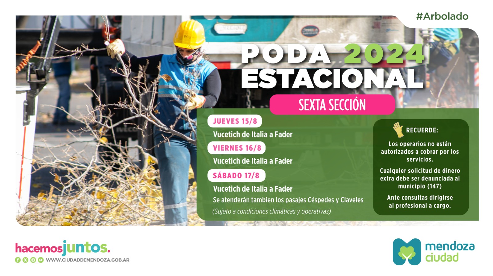 La Municipalidad de la Ciudad de Mendoza comunica un nuevo cronograma de tareas en el marco de la poda estacional 2024. El mismo se extenderá desde el jueves 15 al martes 19 de este mes, y contiene detalladamente los sectores que se verán beneficiados. Es importante señalar que la poda estacional se va a concretar hasta el 31 de agosto.