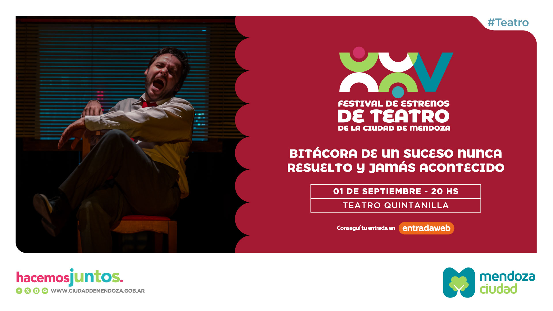 “Bitácora de un suceso nunca resuelto y jamás acontecido” será la gran obra invitada y pensada para la apertura del festival, el domingo 1 de septiembre a las 20 en el Quintanilla. En tanto, la jornada de premiación será el domingo 8 de septiembre a las 21, también, en el teatro Quintanilla.