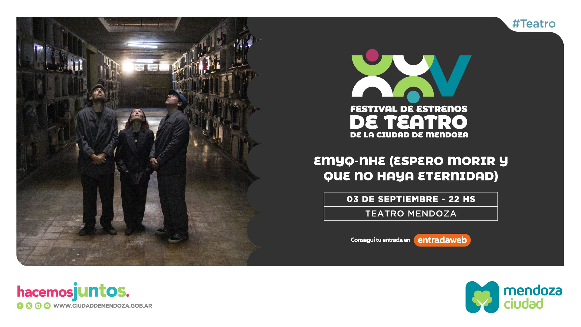 Teatro Mendoza, 22 h. Obra: “EMYQ-NHE (Espero morir y que no haya eternidad)”. Cuenta la historia de una familia de sepultureros en la cual un joven pierde a su padre y una joven desea salir de los mandatos sociales. Esta puesta en escena cruzada por distintas poéticas construye la metáfora que nos introduce en un ritual de despedida que celebra la vida a pesar de su profunda reflexión sobre la finitud de las cosas. Esta familia de sepultureros, metonimia de una sociedad, atraviesa los vericuetos del teatro para entregarnos una ceremonia llena de profundas heridas que sanarán si es que no hay eternidad. Apta para mayores de 16 años.