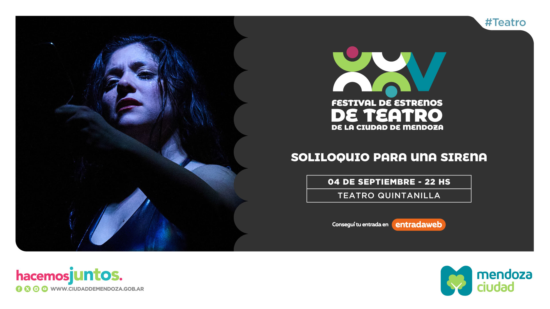 Teatro Quintanilla, 22 h. Obra: “Soliloquio para una Sirena”. La actriz “Sofía Fuentes” es rechazada por una industria plástica y fría, lo que la impulsa a rearmarse y construir su ópera prima y su obra maestra, que se convierte en su vida entera. El paso de los años y el ritmo de su vida artística comienzan a desgastarla. La soledad, sus miedos y el vacío inundan su interior con más fuerza. La presión social y familiar se vuelve cada vez más fuerte y el peligro de derrumbe se siente cada vez más cerca. Ella hará lo imposible para detenerlo hasta que una noticia la impulsará a tomar la decisión más grande de su vida. Apta para mayores de 14 años.