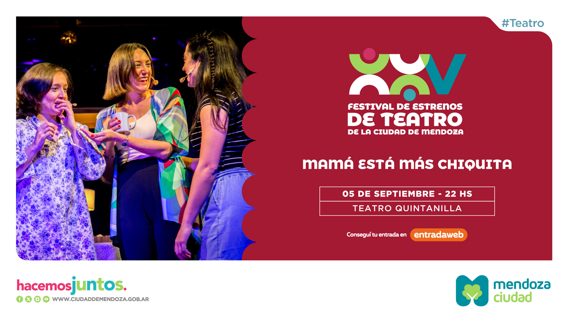 Teatro Quintanilla, 22 h. Obra: “Mamá está más chiquita”. Este trabajo cuenta la historia de Rita, una mujer con dos hijos: Diego y Clara. Él, sumamente sensible, vive en un universo de fantasía que le ganó lugar a la crudeza del mundo real; ella, una adolescente que, de la mano de su novio Germán, busca liberarse de la sobreprotección de su mamá. Una noticia repentina pone en jaque las pretensiones de control de Rita: se está haciendo más chiquita. Apta para público mayor de 13 años.