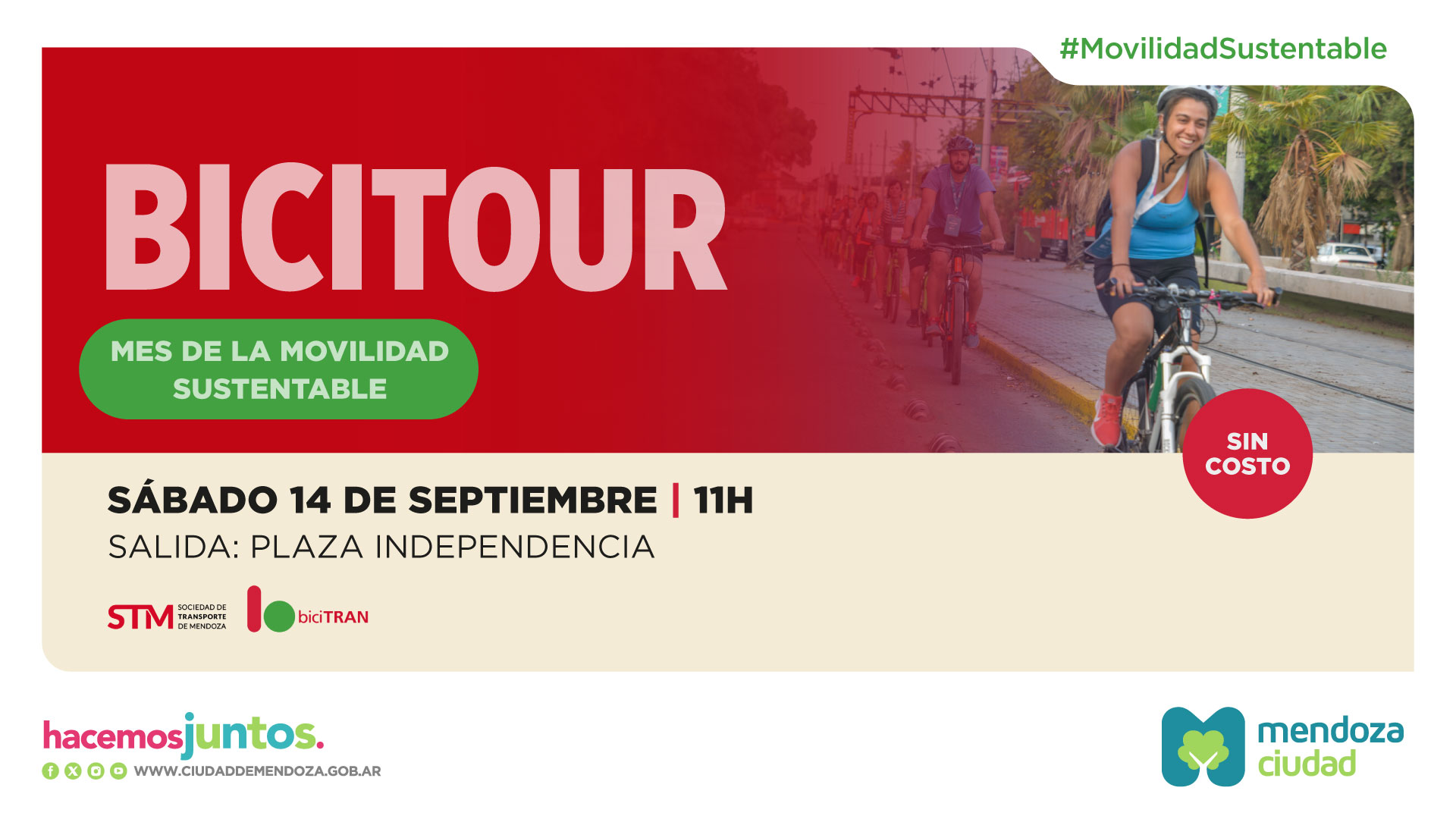 En el marco del Mes de la Movilidad Sustentable, la Ciudad de Mendoza junto al programa BiciTran (STM) se preparan para promover alternativas de transporte amigables con el medioambiente y fomentar hábitos de vida saludable. Este septiembre, el protagonismo lo tiene la bicicleta, por eso haremos una bicicleteada por distintos puntos del departamento, vinculando actores claves en el desarrollo de una Ciudad más sustentable y sostenible. La cita será el próximo sábado 14 de septiembre, a las 11 horas, desde el cartel corpóreo #AmoMendoza de la plaza Independencia.