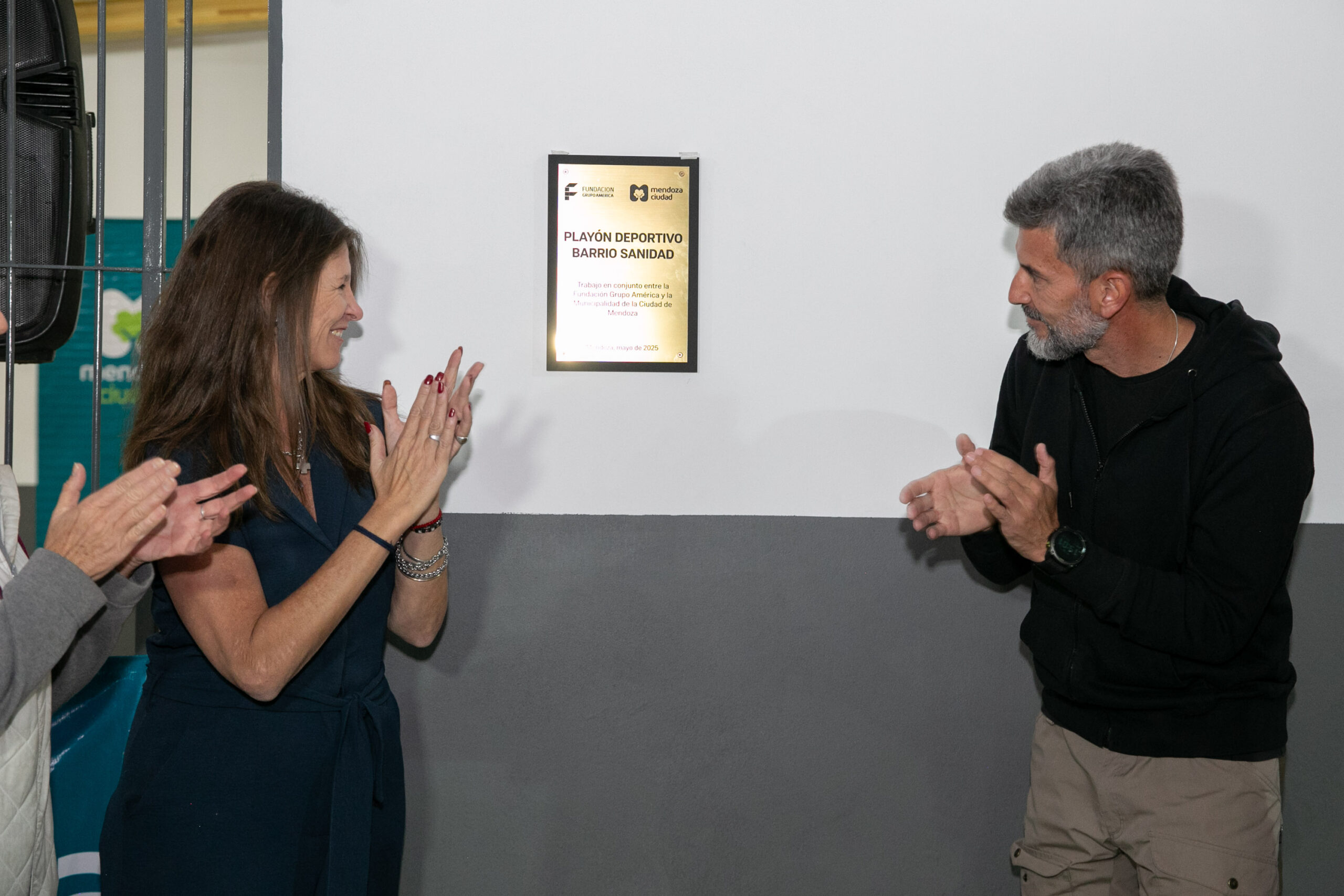 Este martes, el intendente de la Ciudad de Mendoza, Ulpiano Suarez, junto con la directora ejecutiva de la Fundación Grupo América, Gabriela Alé, inauguraron el salón de usos múltiples (SUM) del playón deportivo del barrio Sanidad. Este nuevo espacio, refuncionalizado gracias al trabajo articulado entre el municipio y el sector privado, se suma como un valioso punto de encuentro y actividad comunitaria para los vecinos y vecinas de esta zona capitalina.