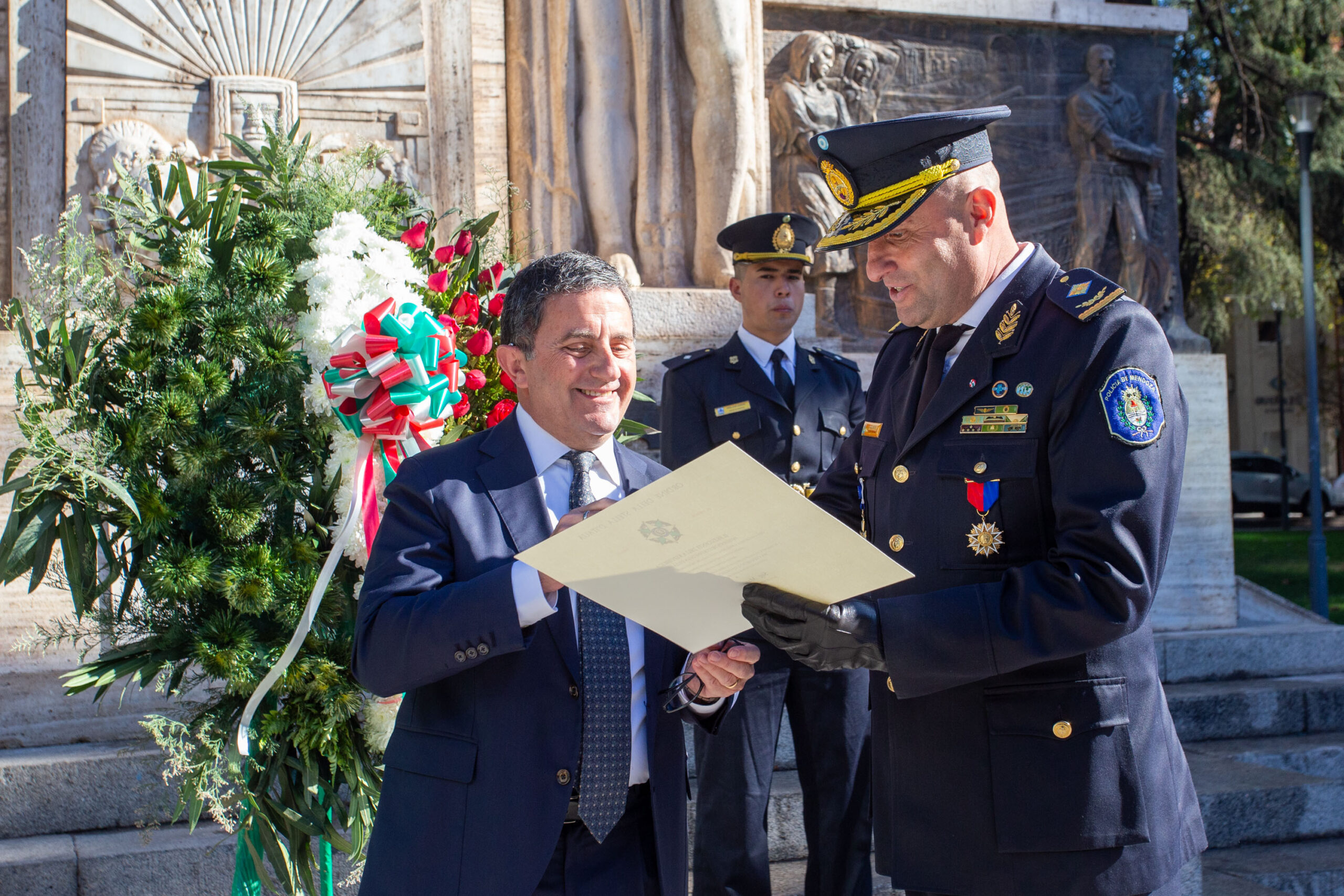 La ceremonia comenzó con el ingreso de las banderas de ceremonia de Argentina, Italia y la provincia de Mendoza. A continuación, se entonaron las estrofas de los himnos nacionales argentino e italiano, interpretados por la Banda de la Policía Cabo Primero Gustavo Ramet y el Coro Italiano.