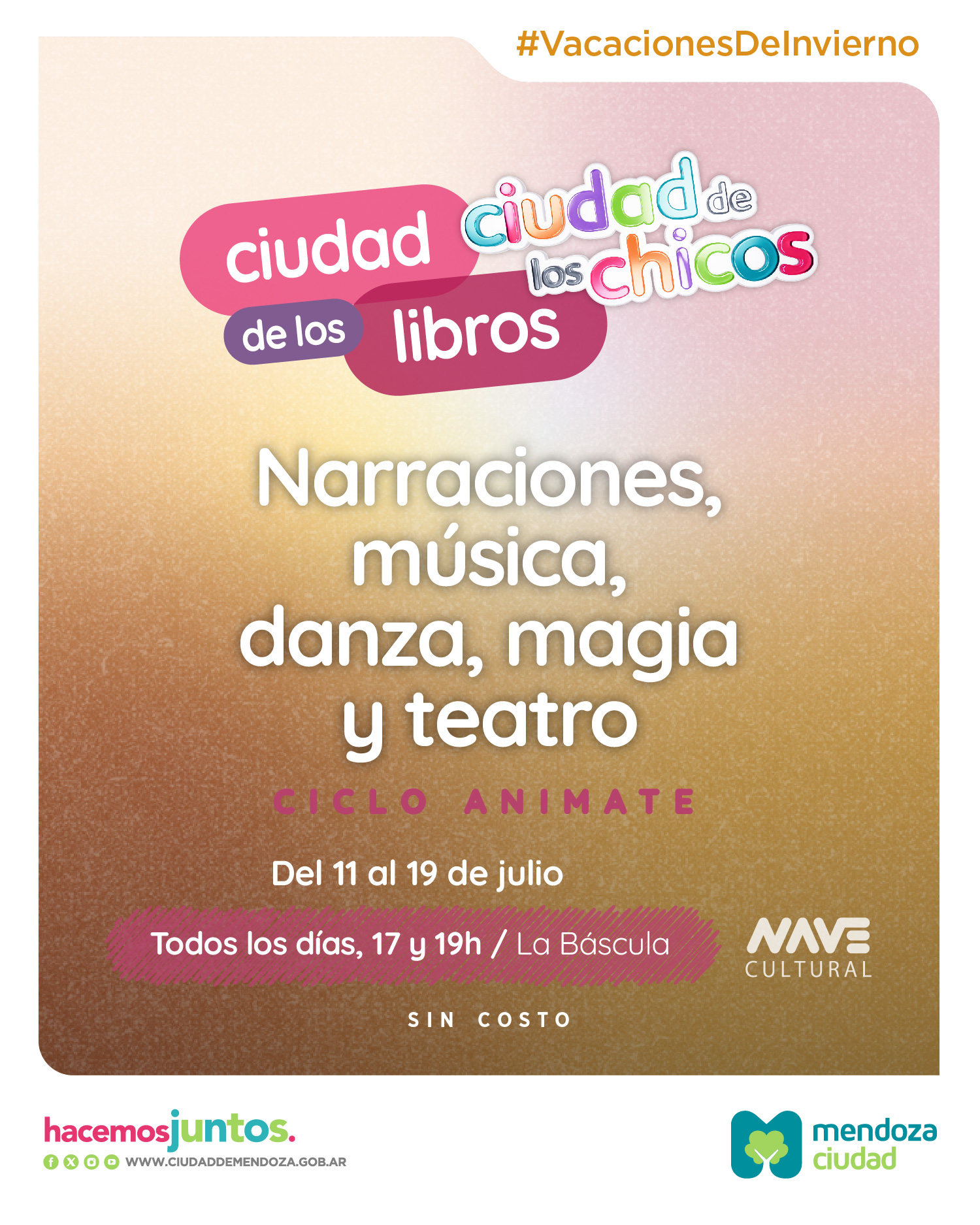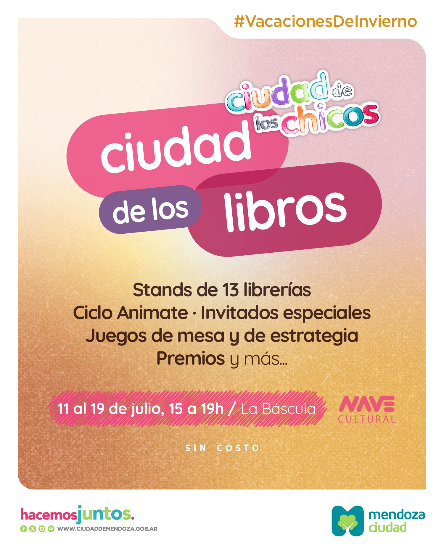 Del 7 al 20 de julio, los espacios culturales de la capital mendocina se llenan de opciones gratuitas y accesibles para familias y turistas. Dentro de las propuestas, Ciudad de los Libros podrá disfrutarse en la Báscula de la Nave Cultural, del 11 al 19 de julio, de 15 a 19 horas. La entrada es sin costo.