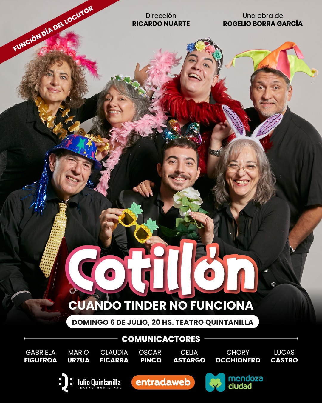 Este domingo 6 de julio a las 20h, el reconocido elenco de periodistas y locutores mendocinos Comunicactores regresa al escenario del Teatro Quintanilla de la Ciudad con una función especial por el Día del Locutor. En esta oportunidad presentarán la desopilante comedia “Cotillón: Cuando Tinder no funciona”, escrita por Rogelio Borra García y dirigida por Ricardo Nuarte.
