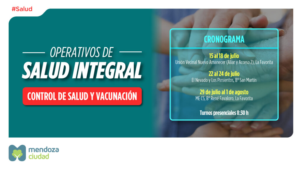 Como parte de su compromiso con la promoción y prevención en salud, la Ciudad de Mendoza desarrollará durante julio una nueva serie de operativos de salud comunitaria en diferentes puntos del territorio capitalino. Las acciones están destinadas a vecinos y vecinas que no cuentan con obra social y se enmarcan dentro de la estrategia de Atención Primaria de la Salud.