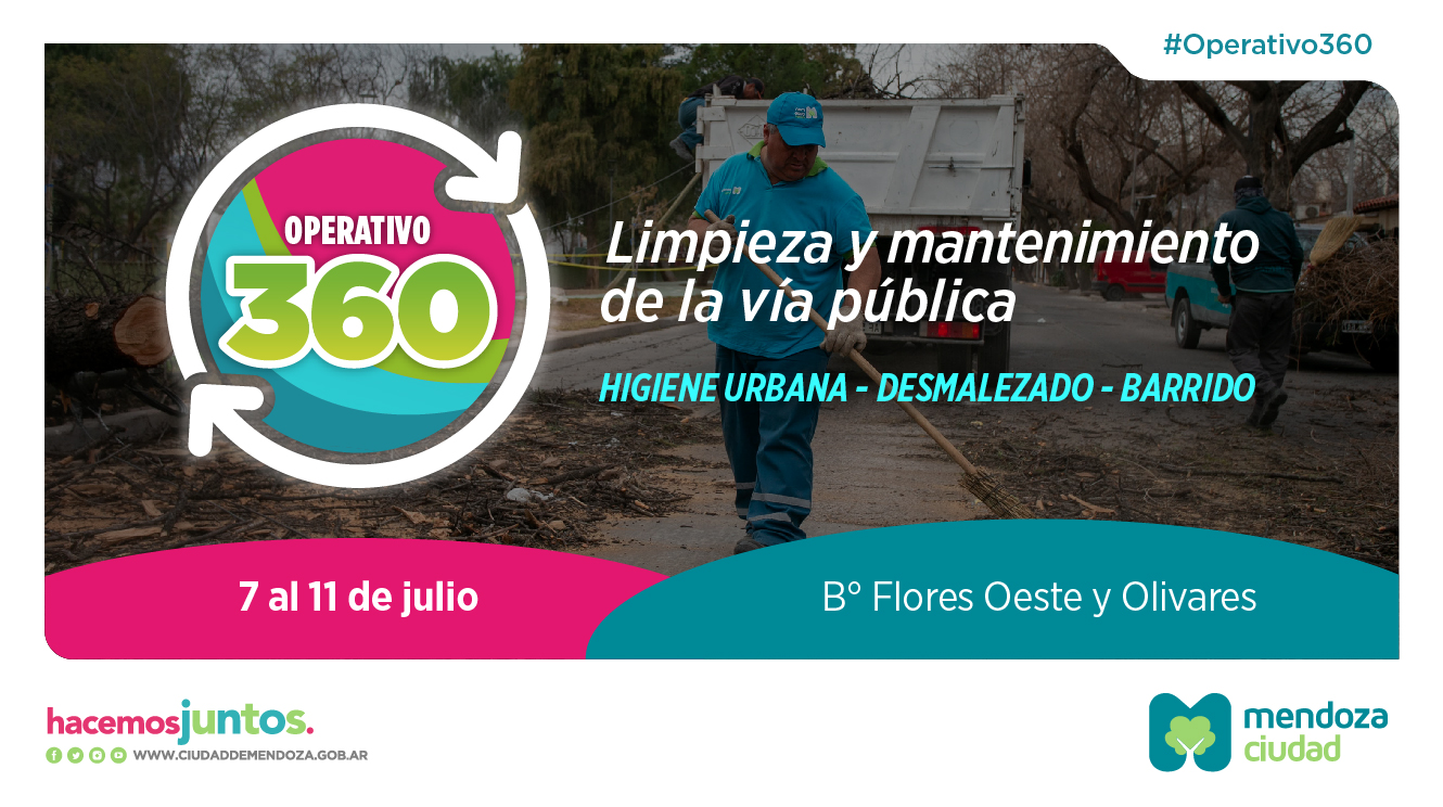 La Ciudad de Mendoza comunica un nuevo cronograma de labores que se llevarán a cabo hasta el 11 de julio, en los barrios Flores oeste (del 7 al 8/7) y 10 y 11-7, en barrio Olivares. Dichas tareas forman parte de los operativos 360 que semanalmente lleva a cabo el municipio.