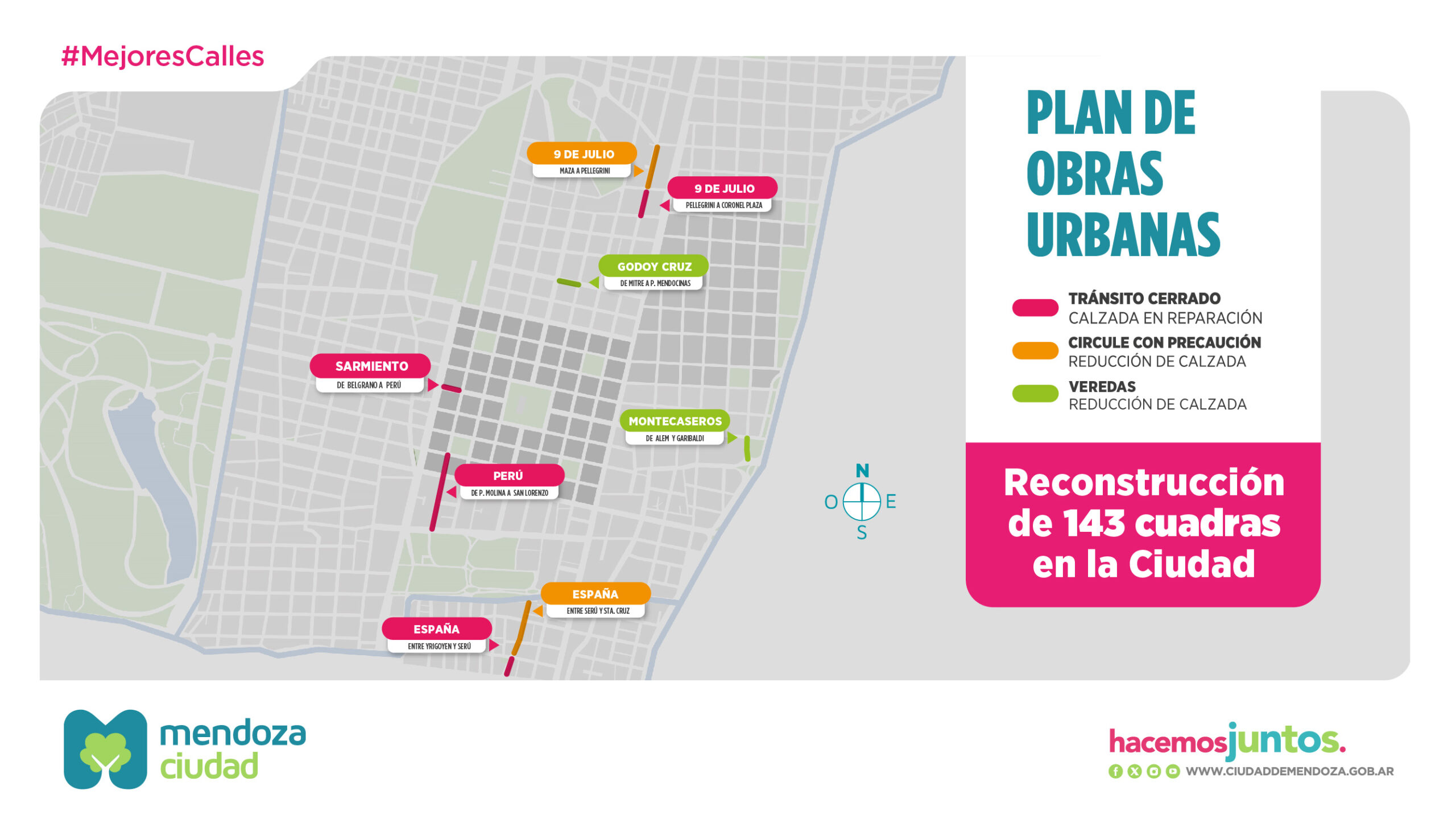 Estos importantes trabajos se relacionan con la reconstrucción de calles en asfalto en diferentes seccionales, en torno a un destacado Plan de Obras Urbanas. La renovación está organizada en tres cuadrantes que incluyen la Primera, Segunda, Tercera, Cuarta, Quinta y Sexta Sección, así como también se prevén sectores del microcentro.