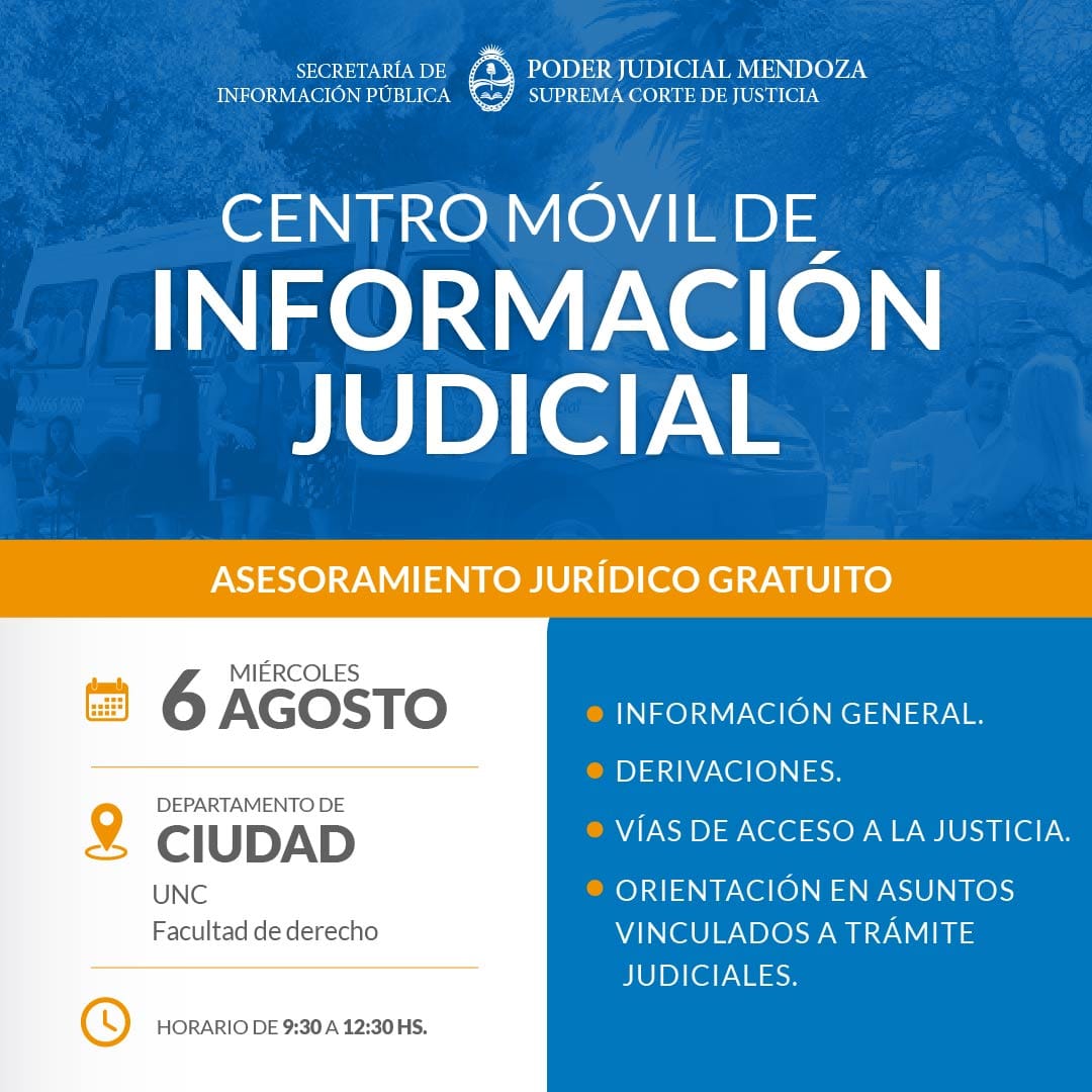 La Municipalidad de Ciudad de Mendoza, en conjunto con el Poder Judicial, brindará información y asesoramiento jurídico a los vecinos y vecinas en agosto. Lo hará a través del Centro Móvil de Información Judicial el miércoles 6, el cual estará ubicado frente a la Facultad de Derecho, en el predio de la Universidad Nacional de Cuyo.