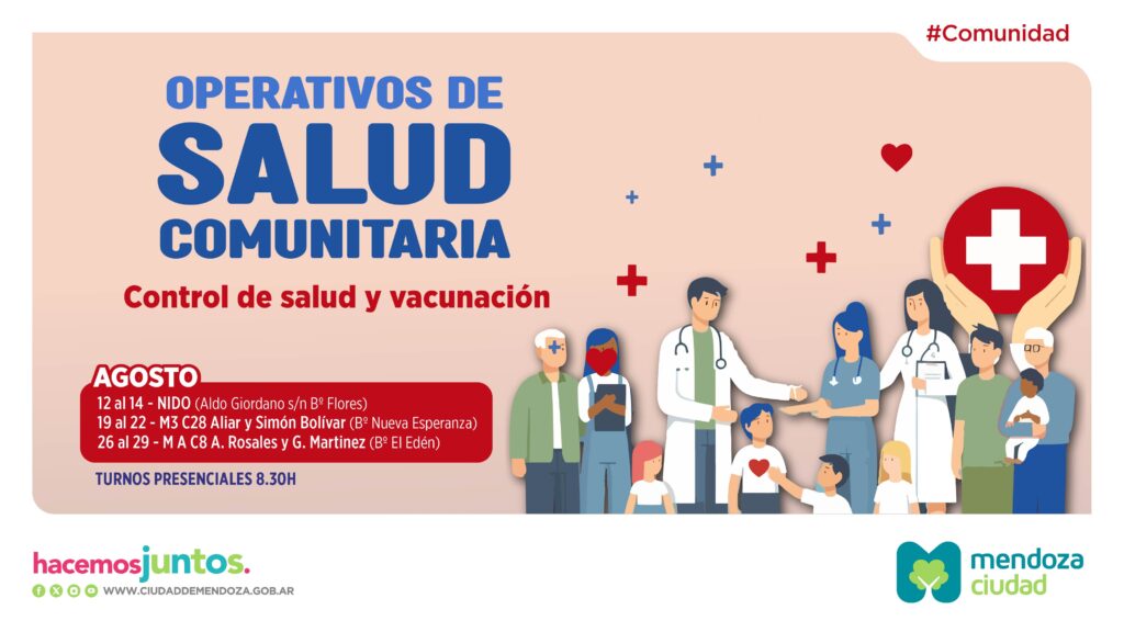 La Ciudad de Mendoza continúa fortaleciendo su política pública de salud mediante acciones territoriales destinadas a promover el bienestar integral de la población. En este marco, durante agosto se realizarán operativos de salud comunitaria en distintos barrios de la Capital.